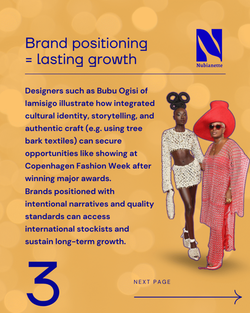 Case Study – Iamisigo (Bubu Ogisi): By integrating indigenous craft traditions (tree bark textiles) with innovative design, Iamisigo secured features at Copenhagen Fashion Week and attracted global stockists.